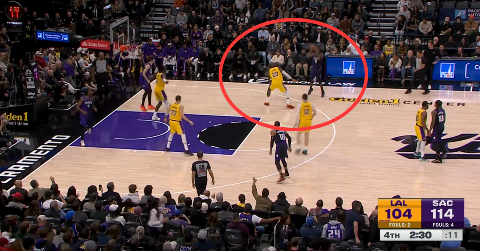 他先是运球来到前场,站在左侧底角附近晃了半天,突然想助攻队友,却把传球给到了对手蒙克的手上。你没有看错,詹皇上来之后,正在追分的关键时刻,他直接传球送给自己的前队友蒙克,一个失误被国王队抢断发起反击。